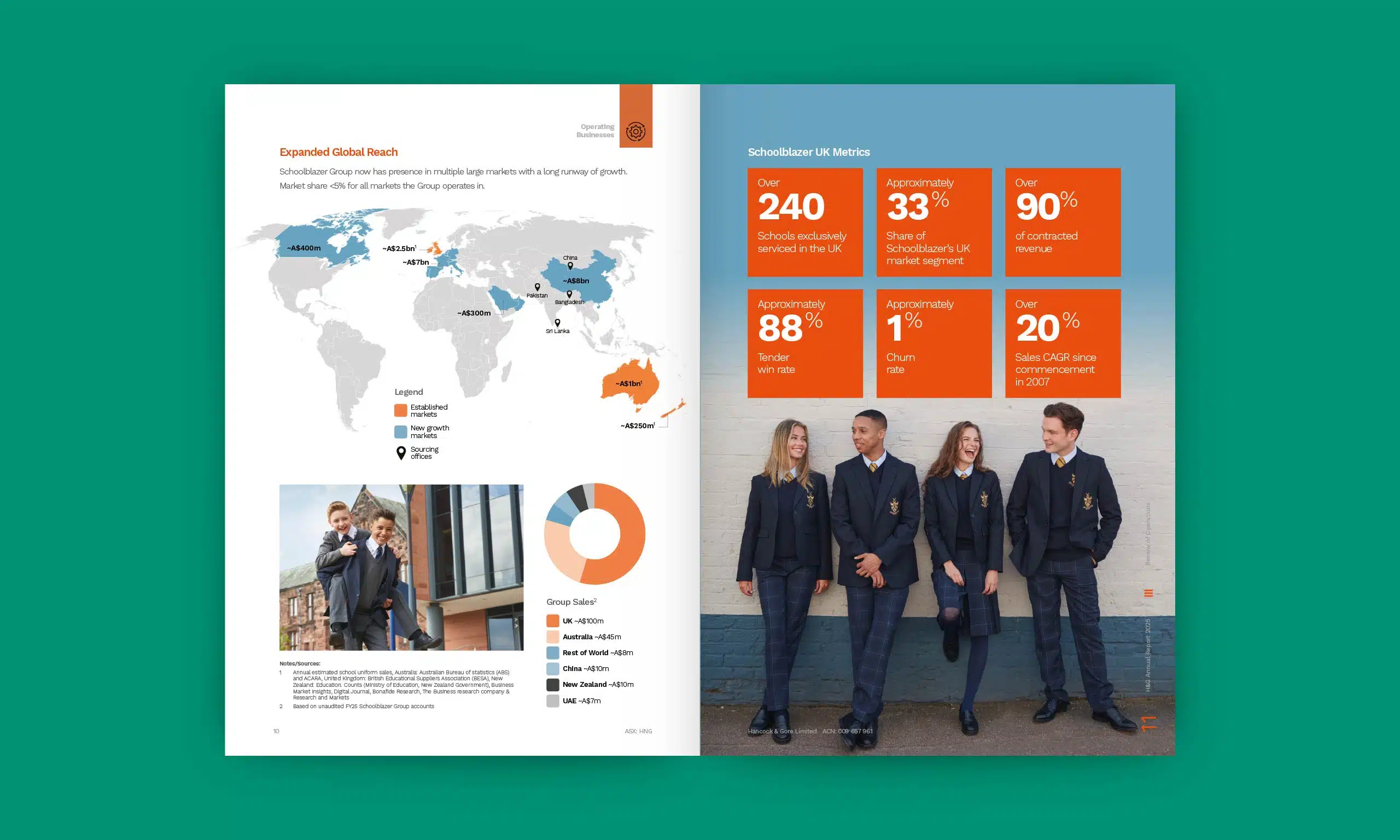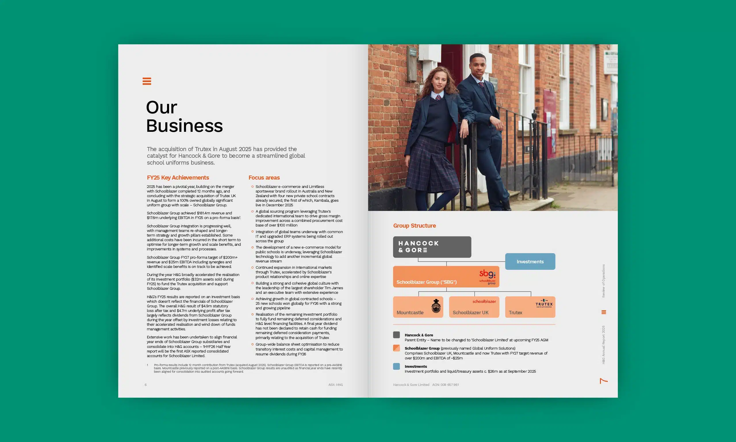APM has worked with Hancock & Gore since 2023, and their report focuses on clean and striking design choices featuring open layouts strong photographs and corporate colours. The asymmetric footer provides a strong anchor to bring together the varied elements of the layout.